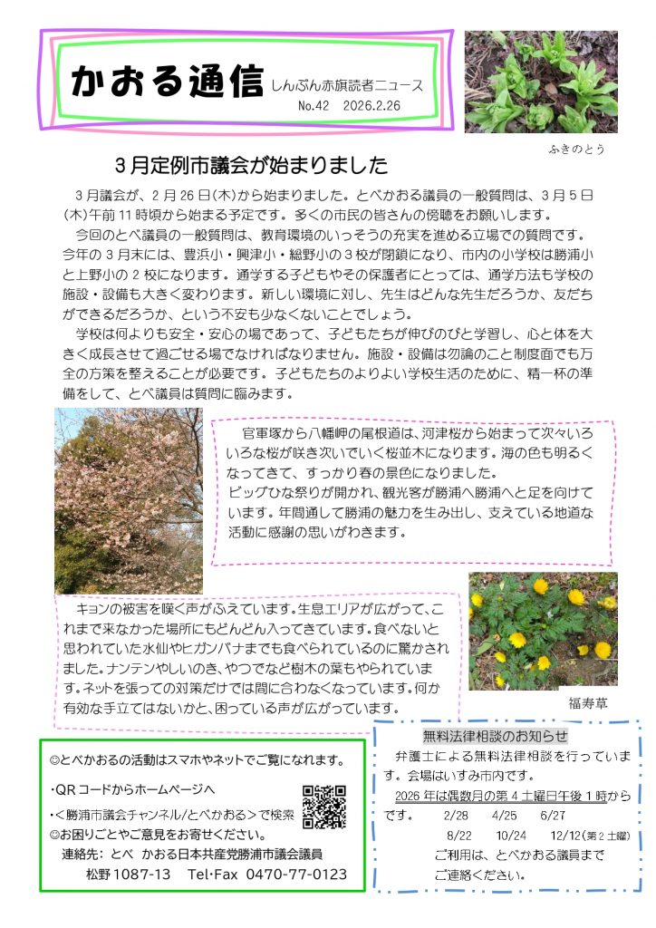 かおる通信 第42号 3 月定例市議会が始まりました3 月議会が、2 月 26 日(木)から始まりました。とべかおる議員の一般質問は、3 月 5 日(木)午前 11 時頃から始まる予定です。 … もっと読む